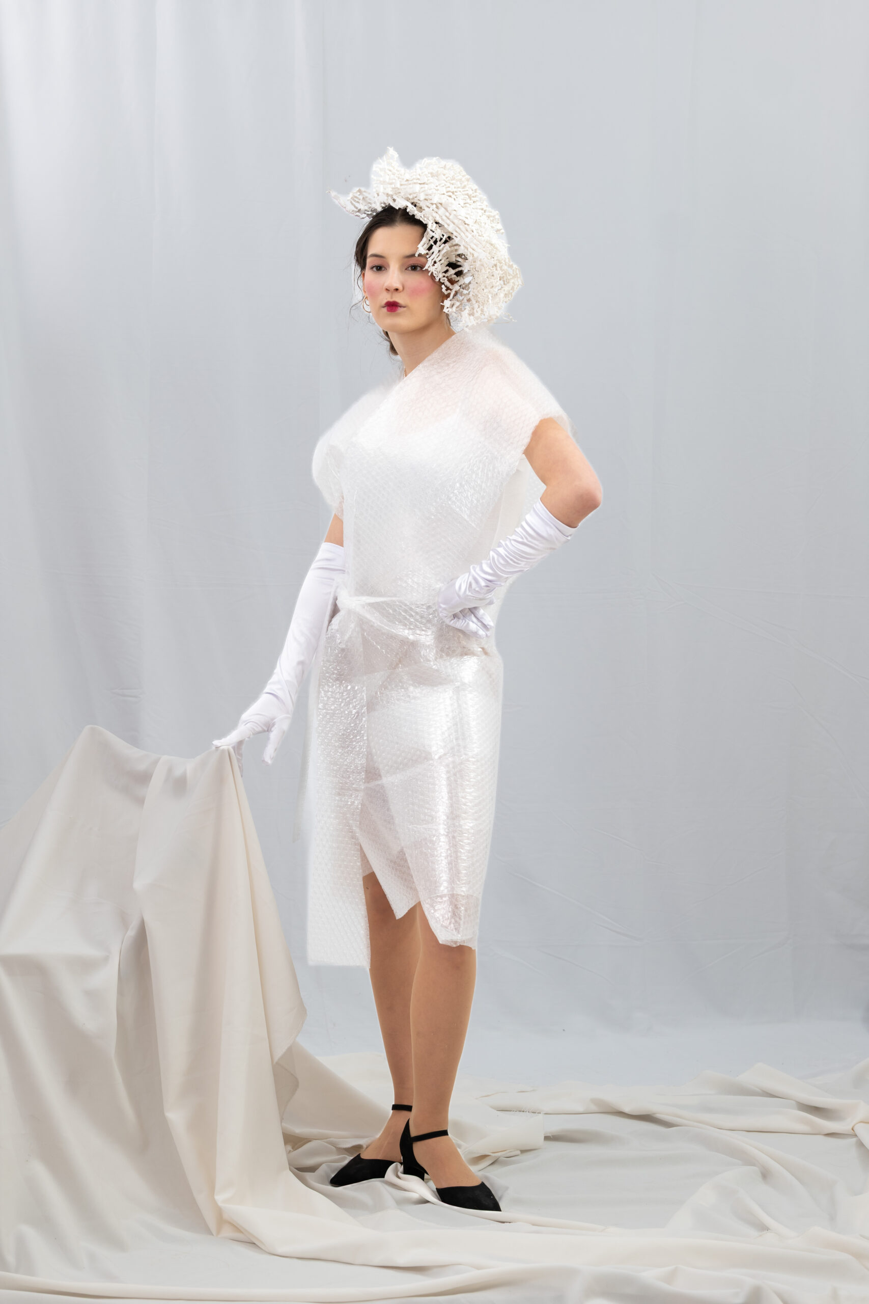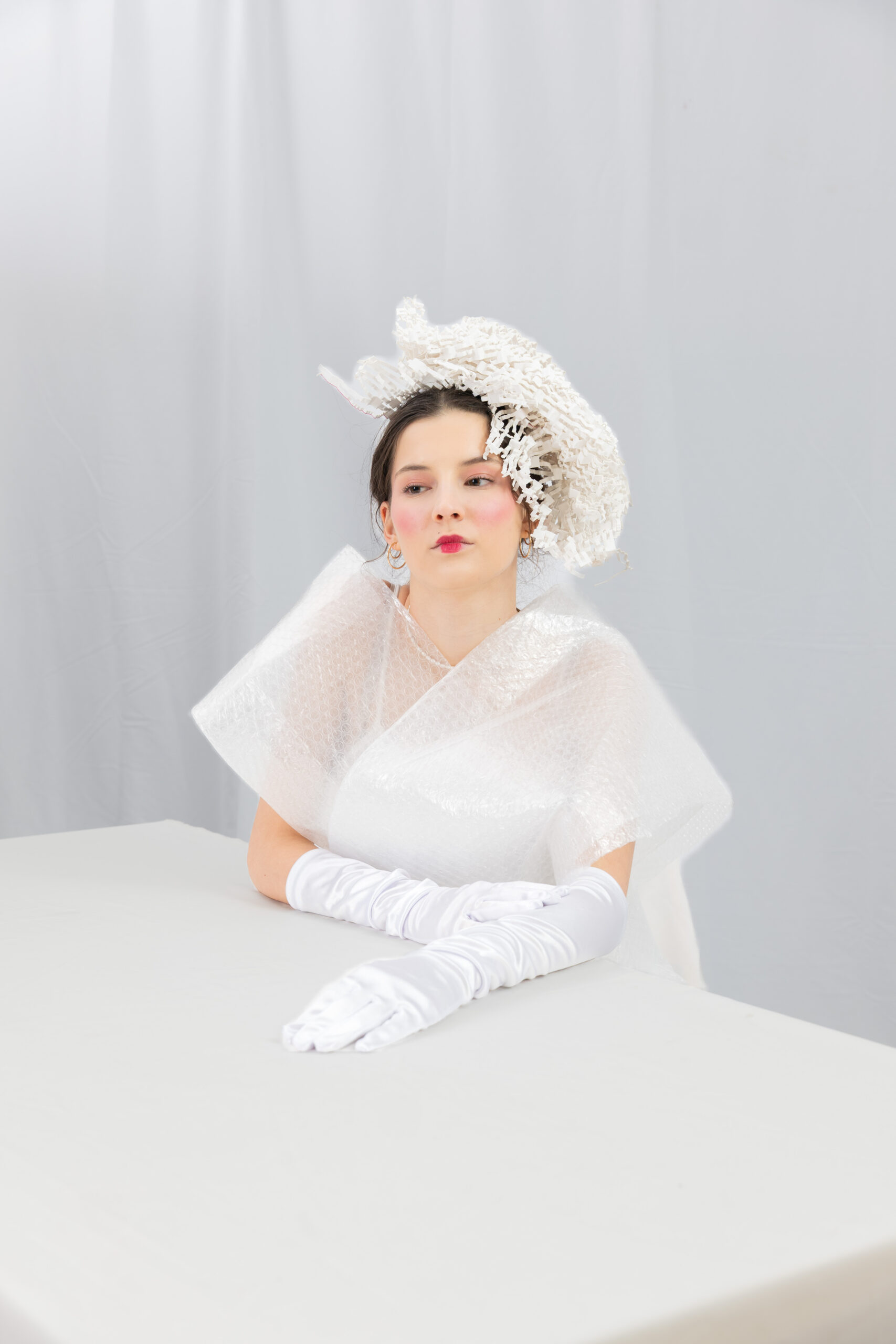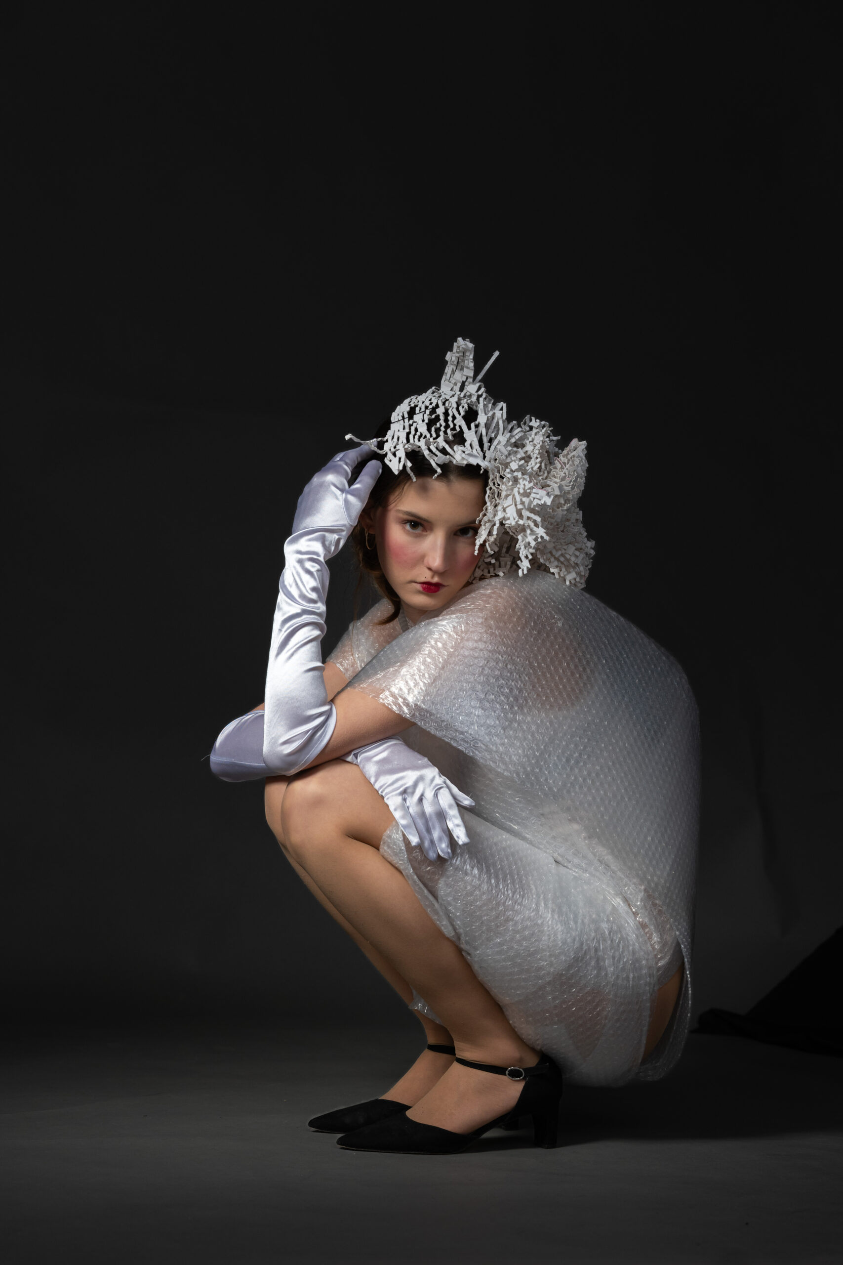 Diese Woche habe ich zusammen mit Model Luna ein paar Experimente in Sachen Modefotografie angestellt. „Luftpolsterfolie“ ist der korrekte Begriff, dazu noch ein paar Papierfasern, die ebenso als Stoßschutz in Paketen eingesetzt waren, als Kopfbedeckung und -schmuck. Das Makeup mit dem Rokoko-Mündchen rundet das Bild perfekt ab.